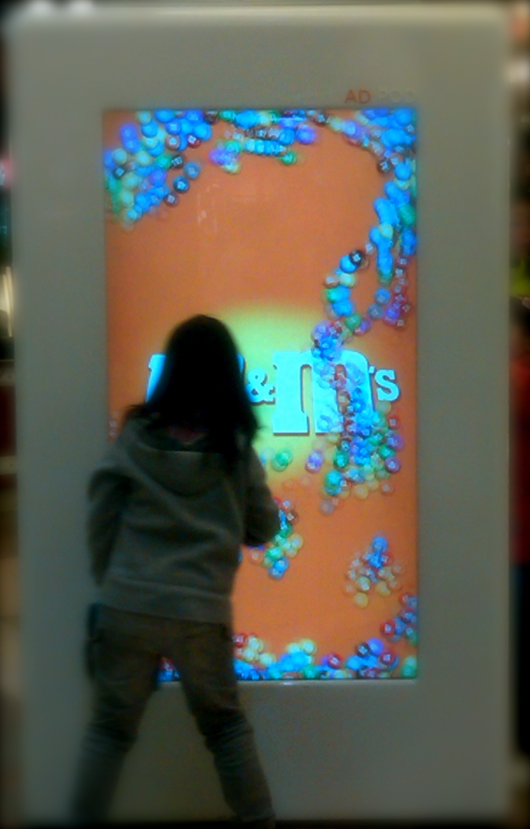 - Let people play with the creative. If you are making it visual — allow people to touch, feel and have fun with it. I saw this installation for M&M’s(on the right) recently at the Fairview Mall in Toronto. Being a bright digital display it was attracting everyone’s attention but also all the kids were just waiting to play with it (including me). Very simple concept the you could move the M&M’s would move around the display with your hands.